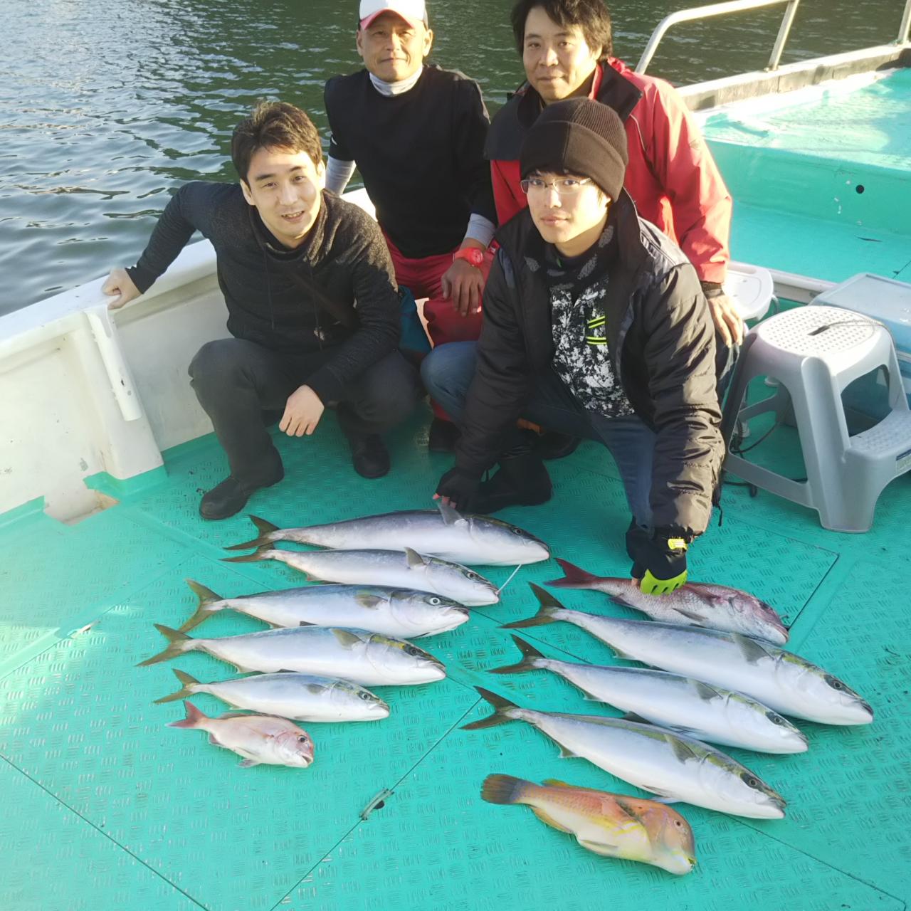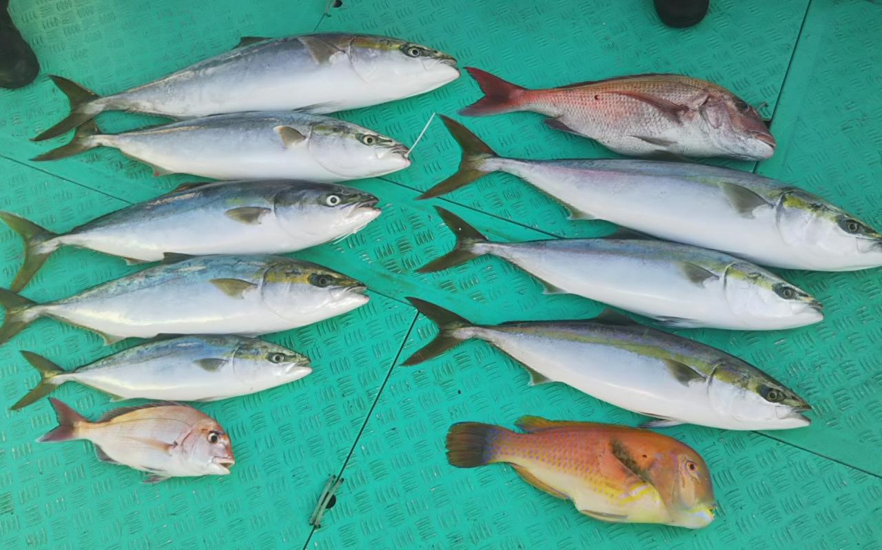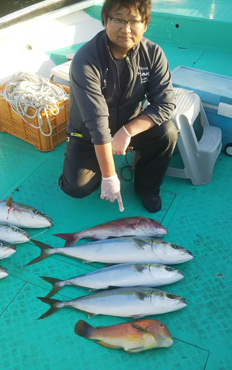 後半食い渋り、ひたすら辛抱の時間のありました。が、全体見れば、ブリ82~84センチ5~6キロ2本、メジロ4~3キロ、マダイ64センチ3キロ、アコウ1.1キロ、マダイ、ヤズ、イラ、