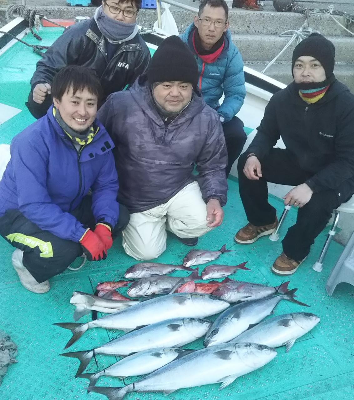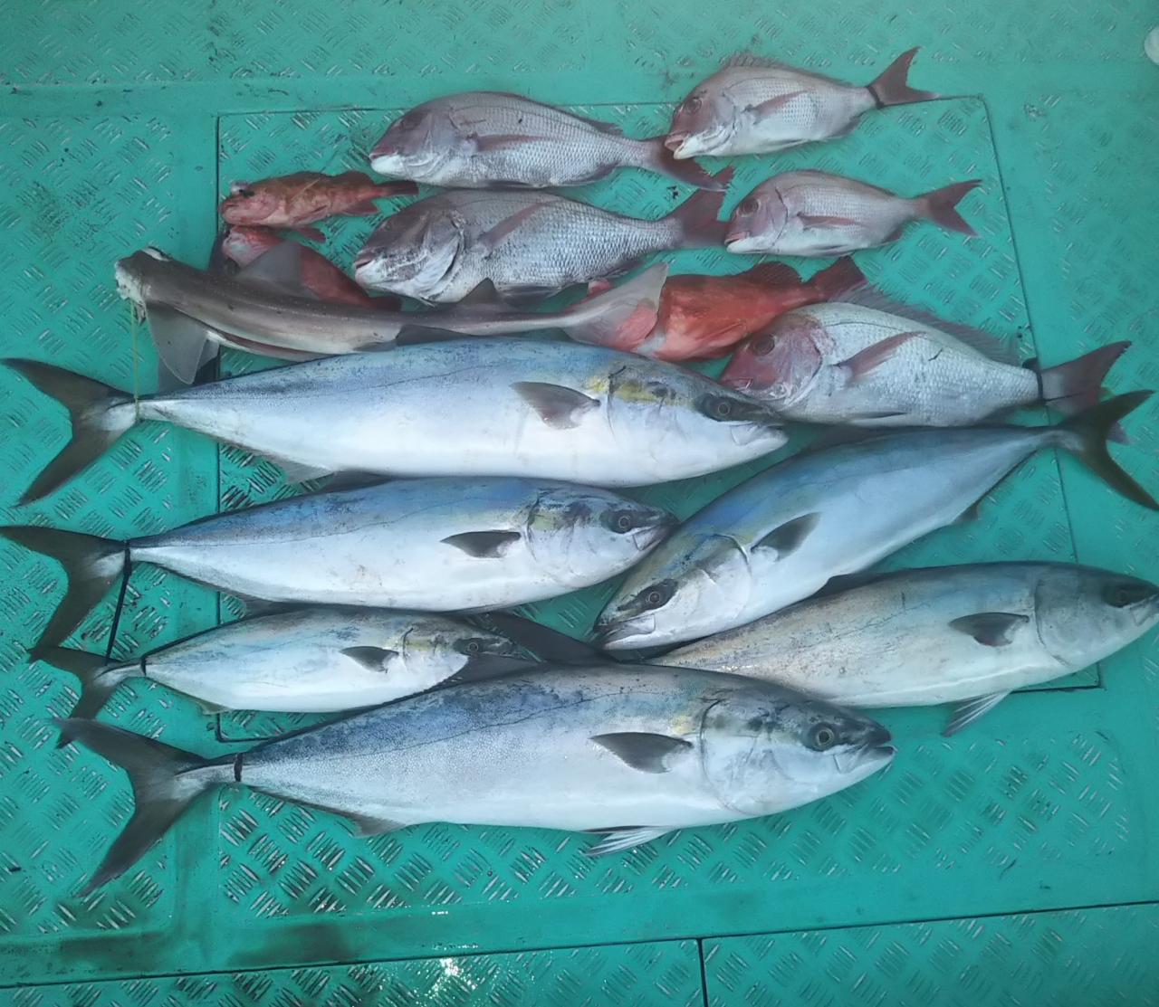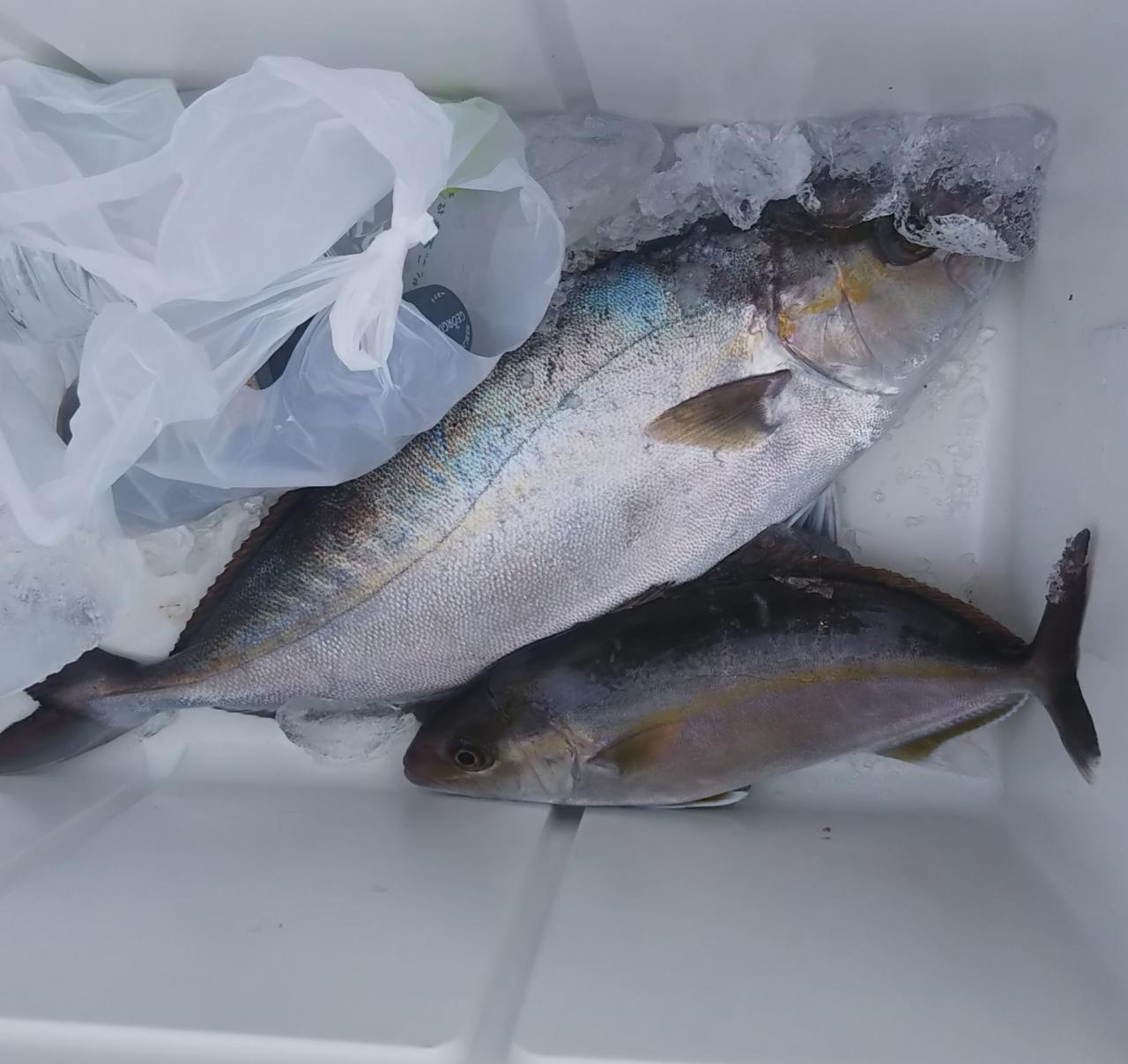 84センチ6キロのブリ2匹、ワラサ3~4キロ、マダイ48センチ頭に~、ヤズ、ダイゴロウ、ヨシキリザメ