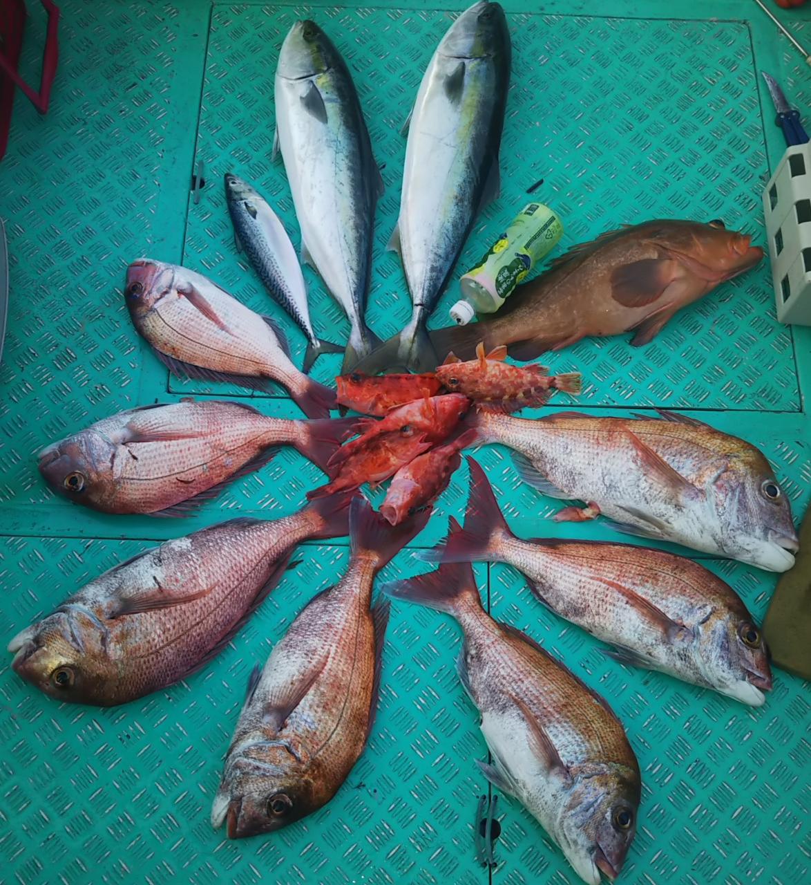 アコウ56センチ、マダイ58センチ~、関サバ、ホゴ、ハマチ3キロ2本