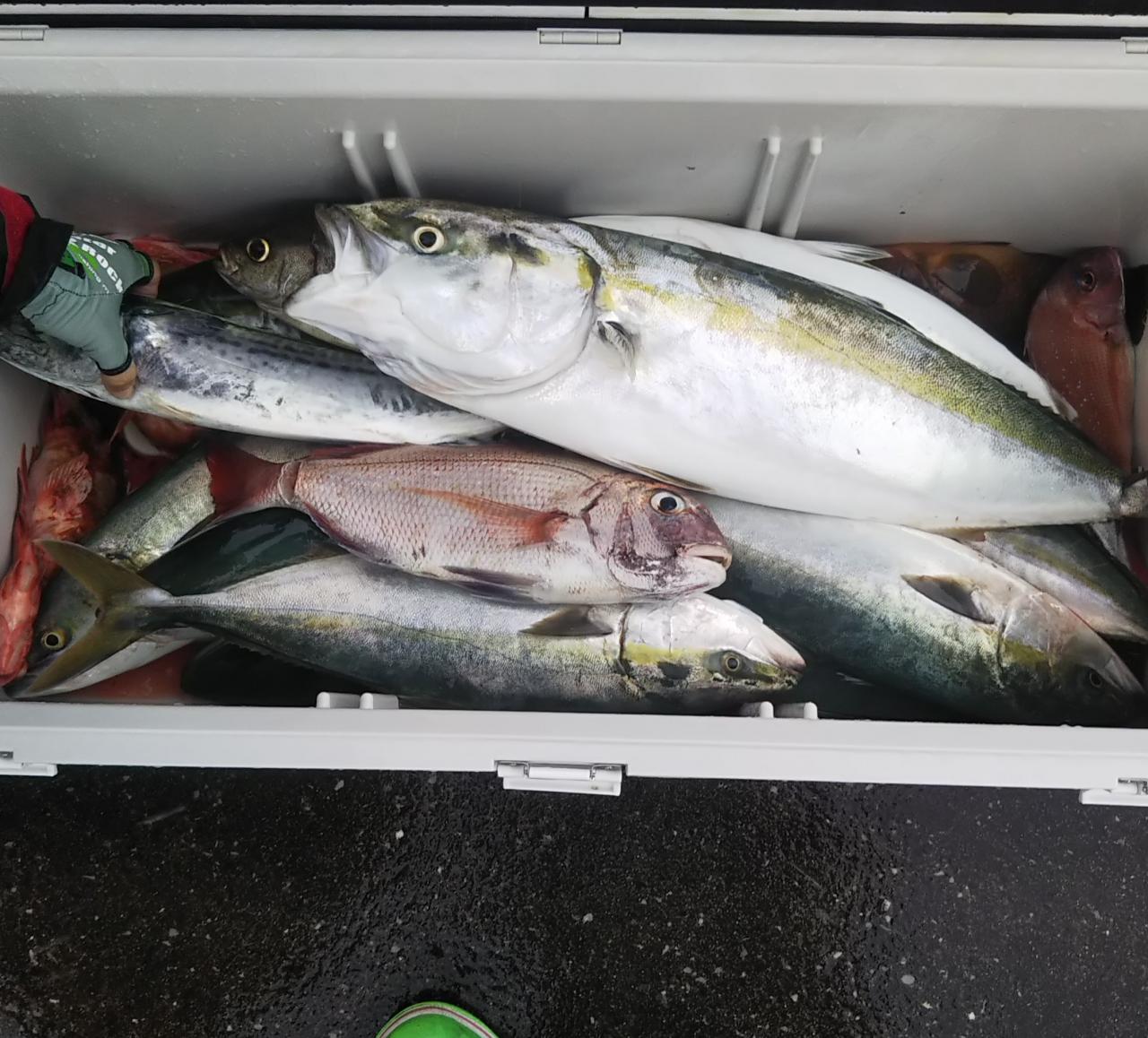 マダイもポツポツ。アオモノも型は小さめのが多かったけど数は多く、ブリも釣れました。