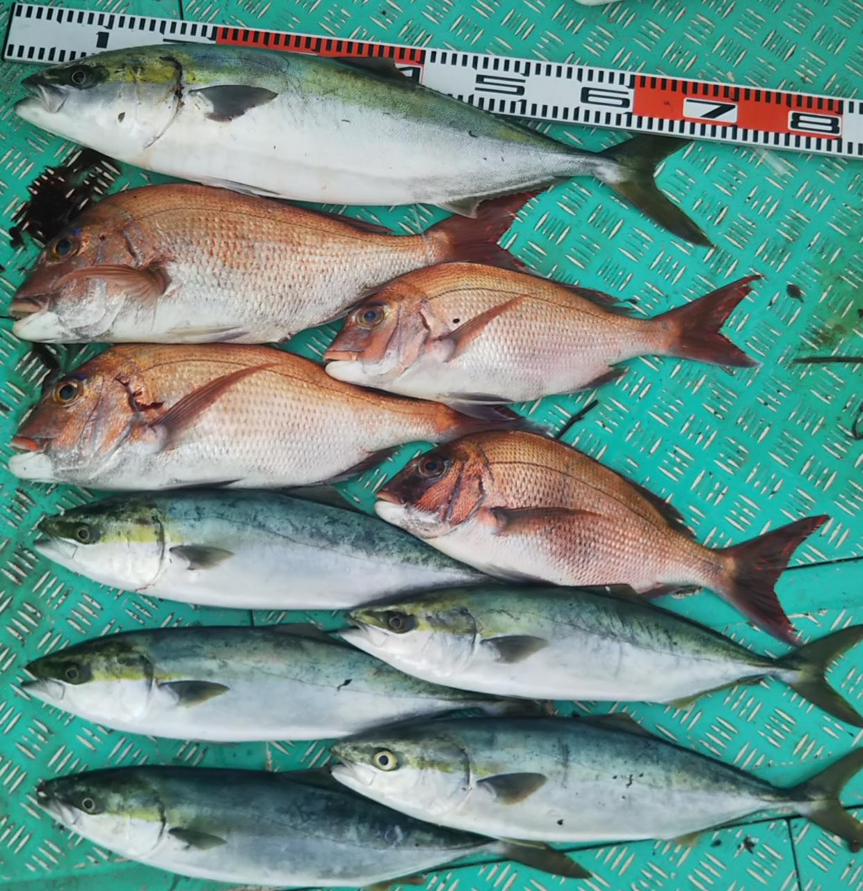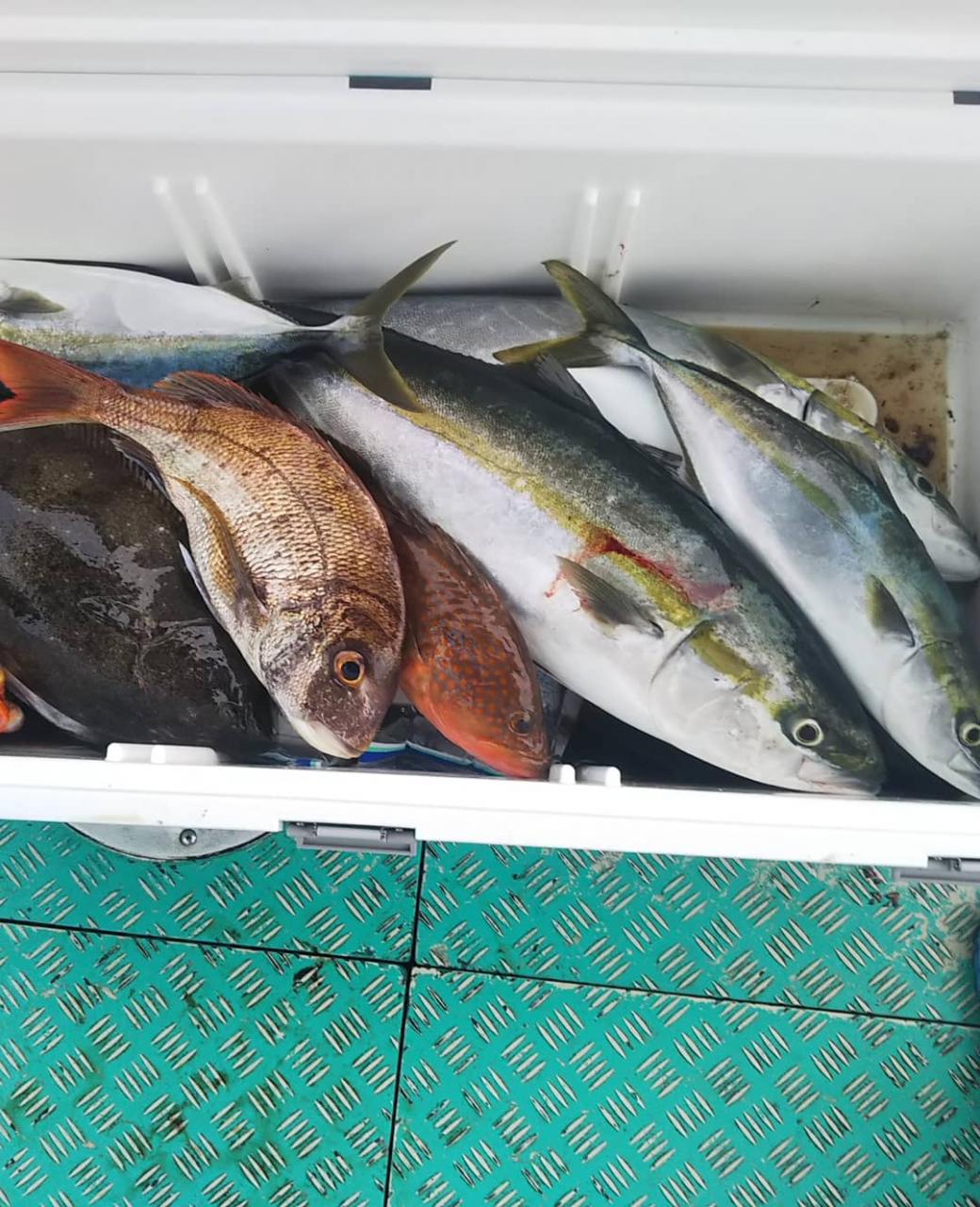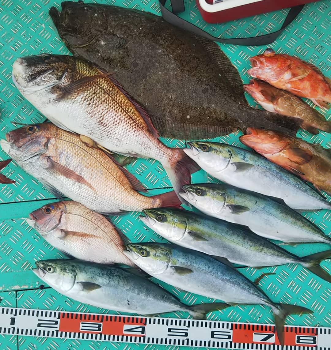 結果、ヒラメ、ハマチ、マダイ、アコウ、ヤズ、ホゴと魚種も豊富に大漁でした~