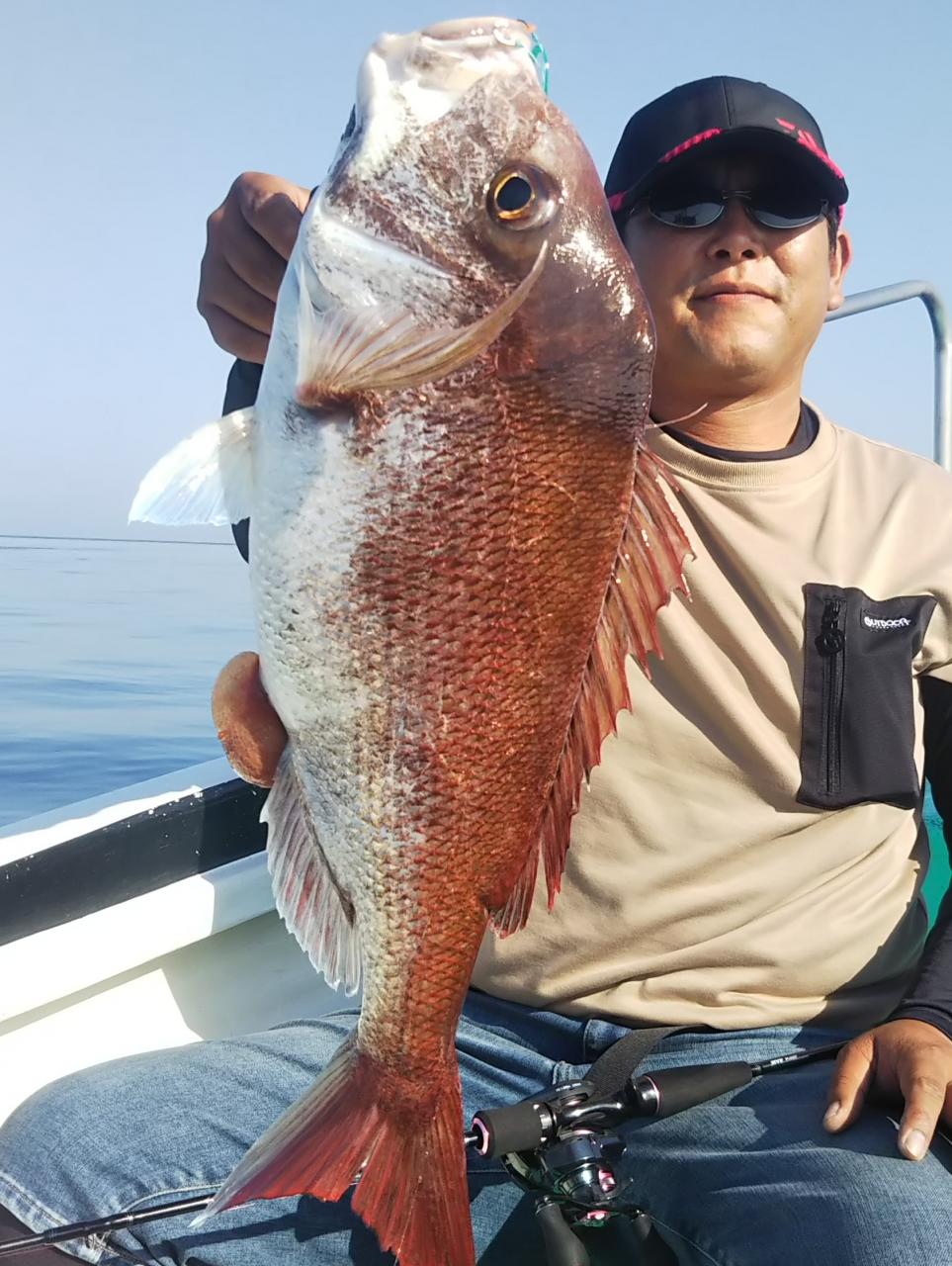 皮一枚で上がって来るマダイ、タモ入れするまでスリル満点です。