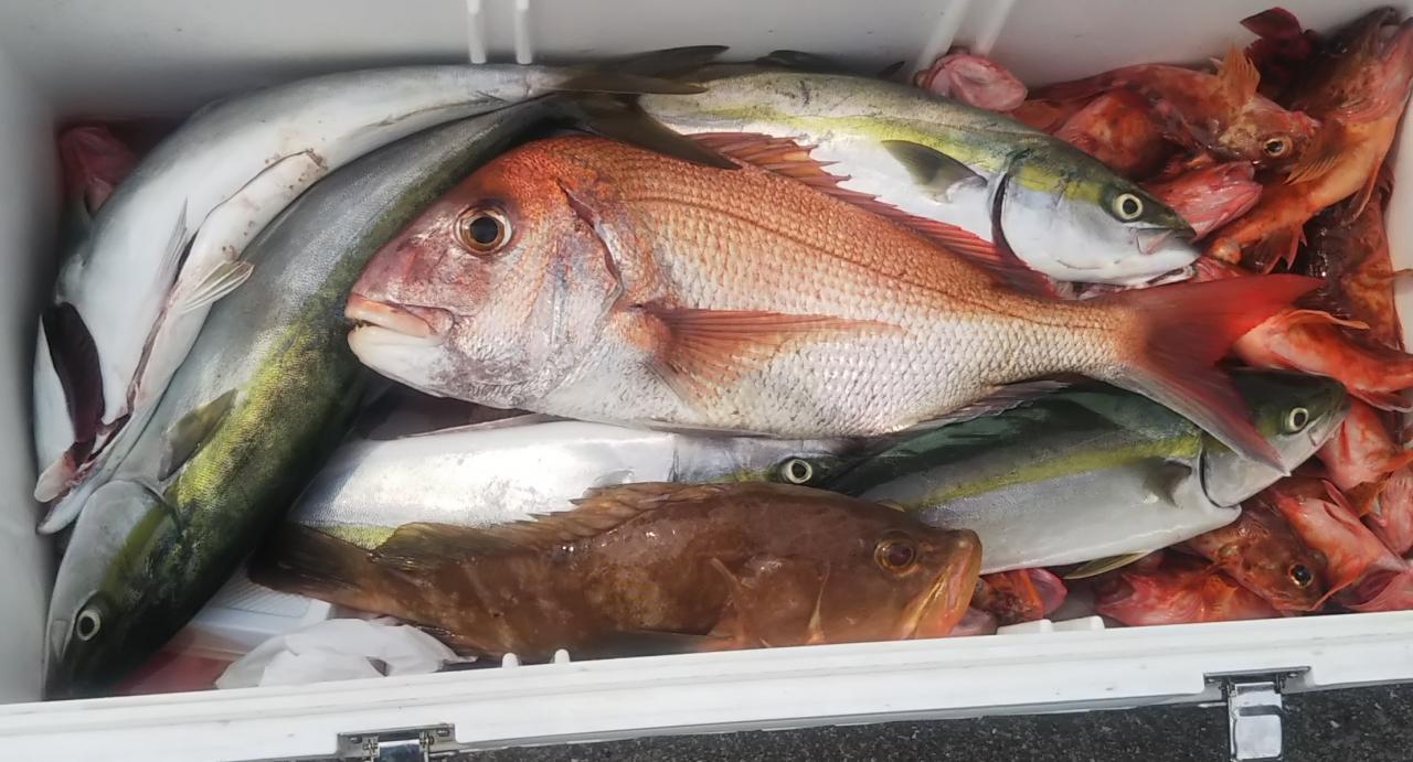 未だ大雨の影響残り、二枚潮で苦労する中でしたが、イラ君を皮切りに2キロマダイ、1.7キロアコウ、ヤズ、デカホゴでお土産は確保でした~