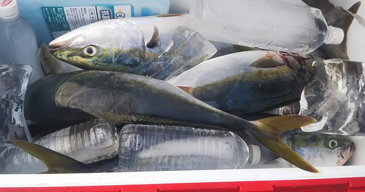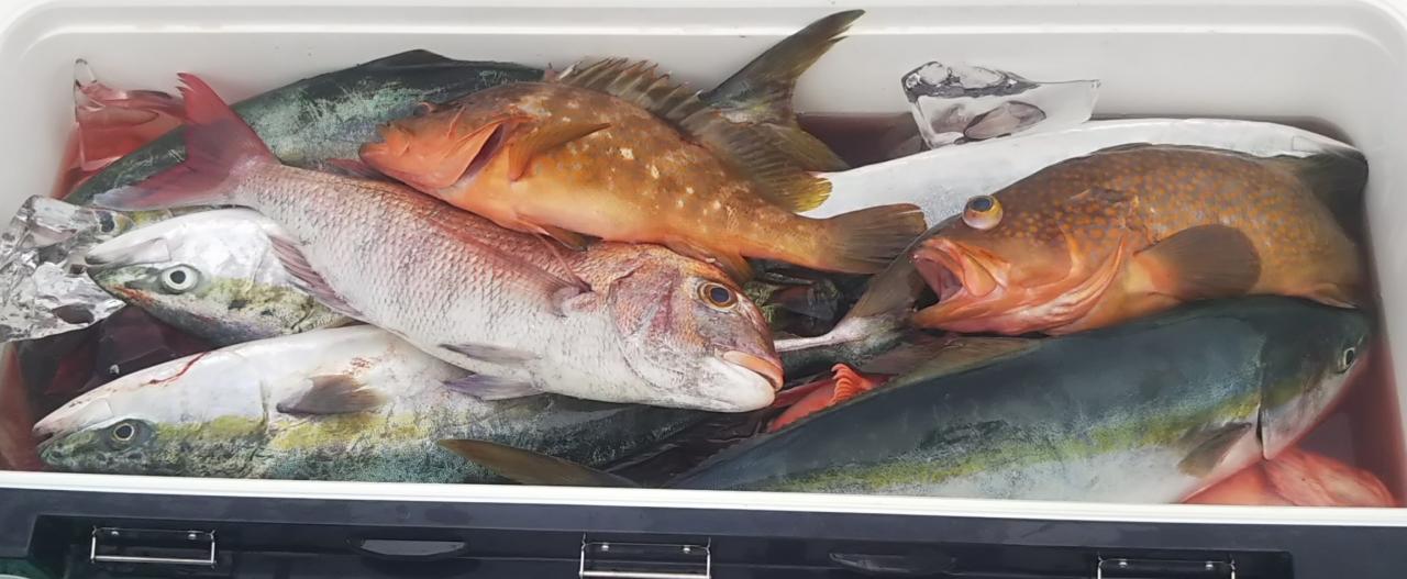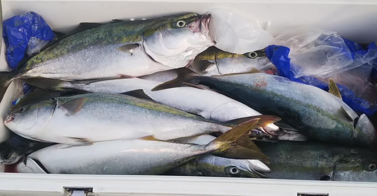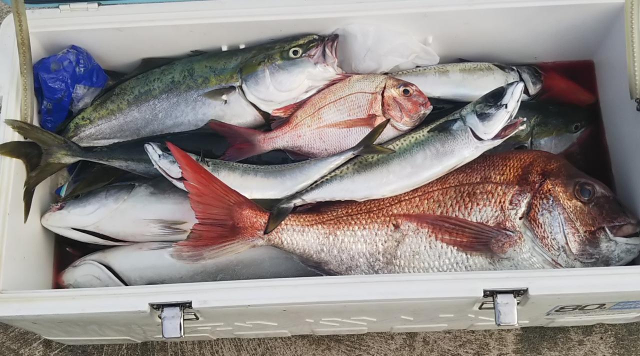 今日は釣りスギ注意報。朝からアオモノラッシュがあり、下げ潮でブリ、マダイ、オオニベ、アコウ、ホゴ、サバ、でクーラーいっぱいになりました~