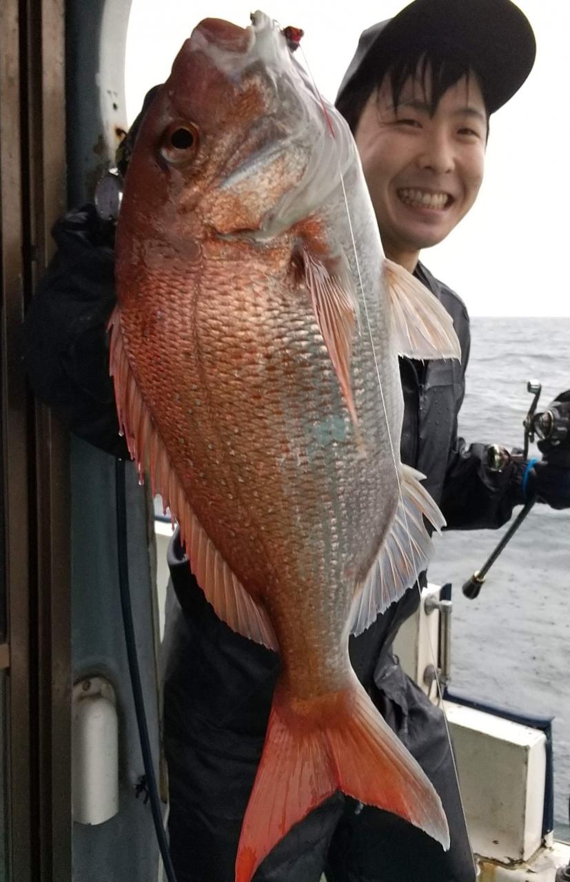 悪天候は心配でしたが、朝からマダイ55センチが来ましたよ~!これはお見事!