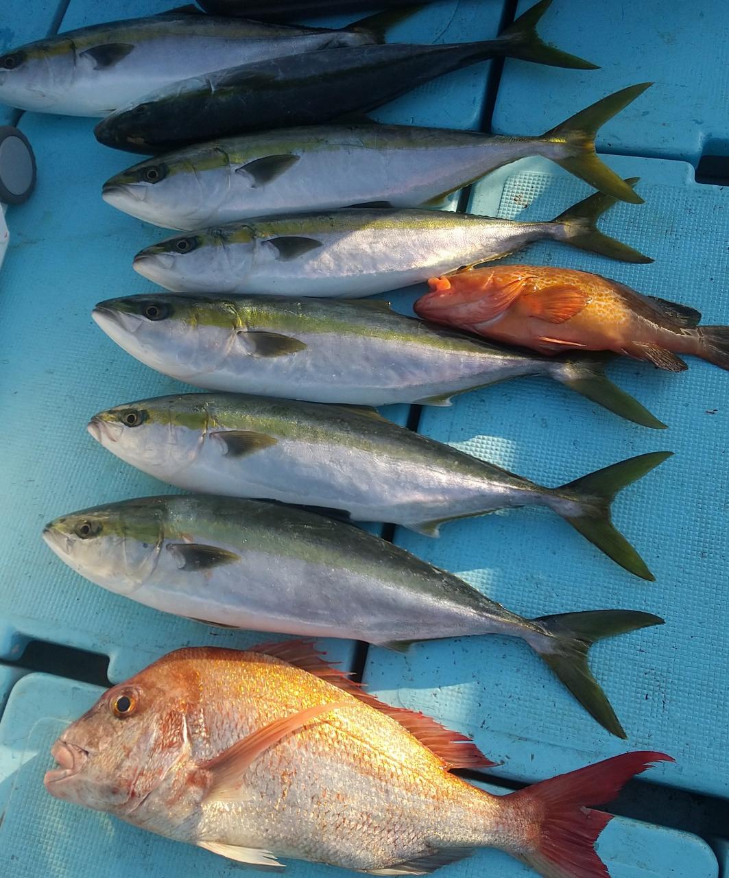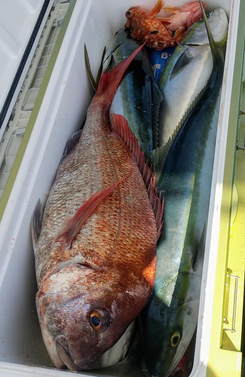 今日は潮がまずまず動いてくれて、マダイ、モウチョットデブリ、ハマチ、アコウ、ホゴで皆さんクーラーいっぱいでした。