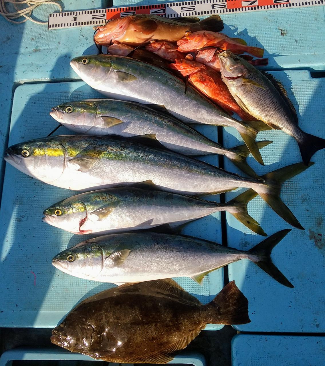 今日は潮回りが決して良くは無かったですが、ヒラメ、ブリ、アコウ、ハマチ、ホウボウ、ホゴでしっかりお土産確保でした。