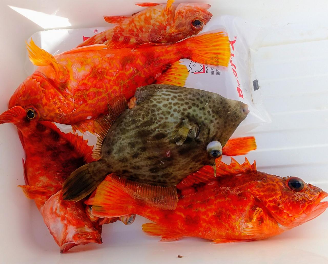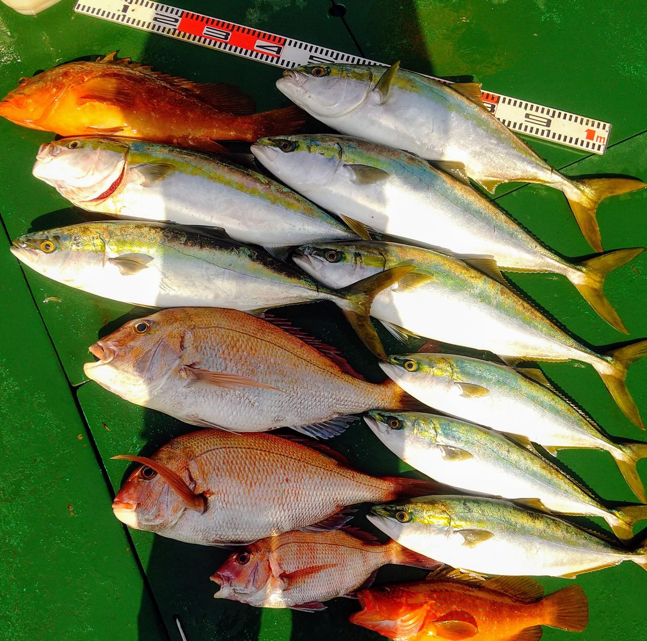 マダイ68センチ〜、アコウ56センチ、ハマチ77センチ〜、デカホゴ、ヤズ、カワハギまで。