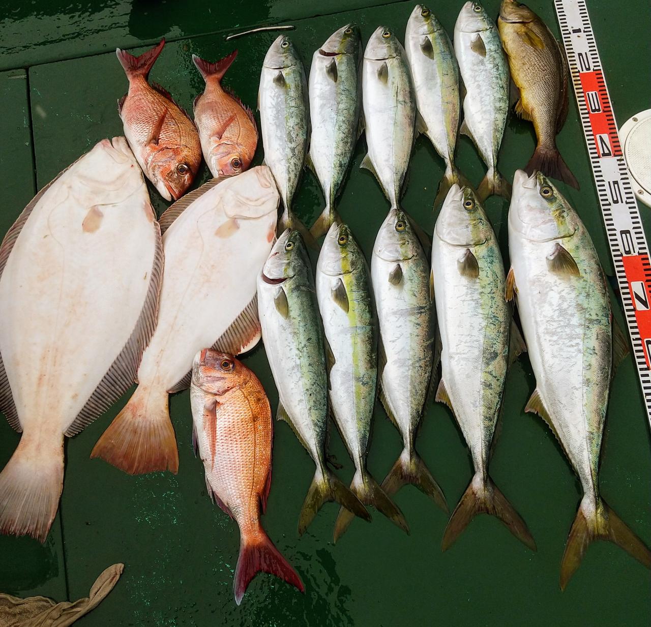 厳しいコンディションにも関わらず、ヒラメ75センチと65センチ、イサキ48センチ、マダイ、ハマチ、ヤズ、ホゴとイイ結果でしたね〜
