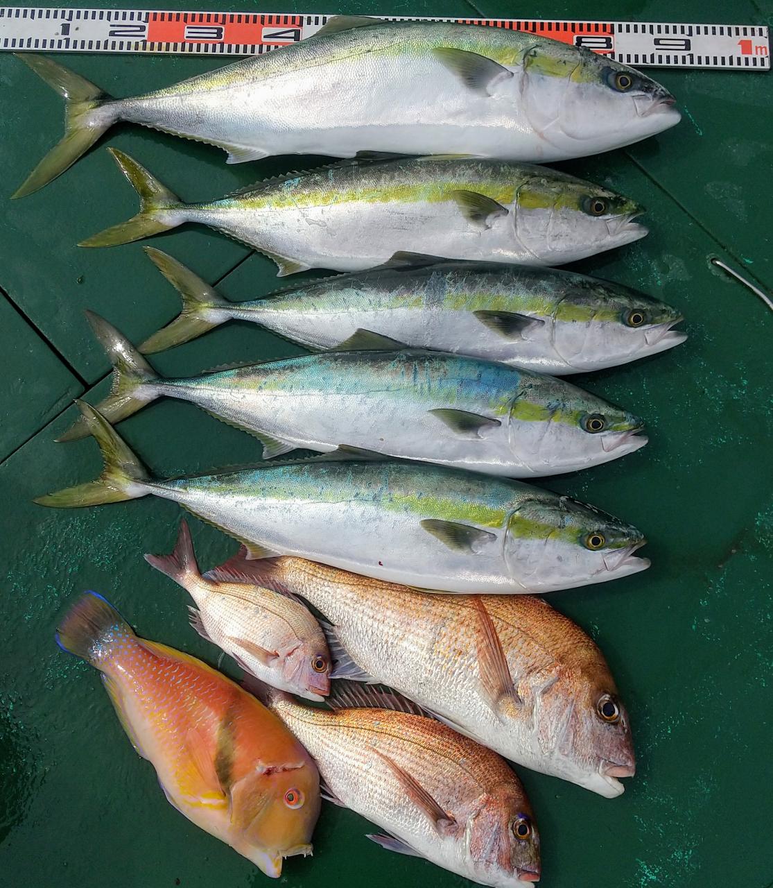 それでも魚影はバッチリで、朝からマダイ、ブリ、ハマチがヒット!
