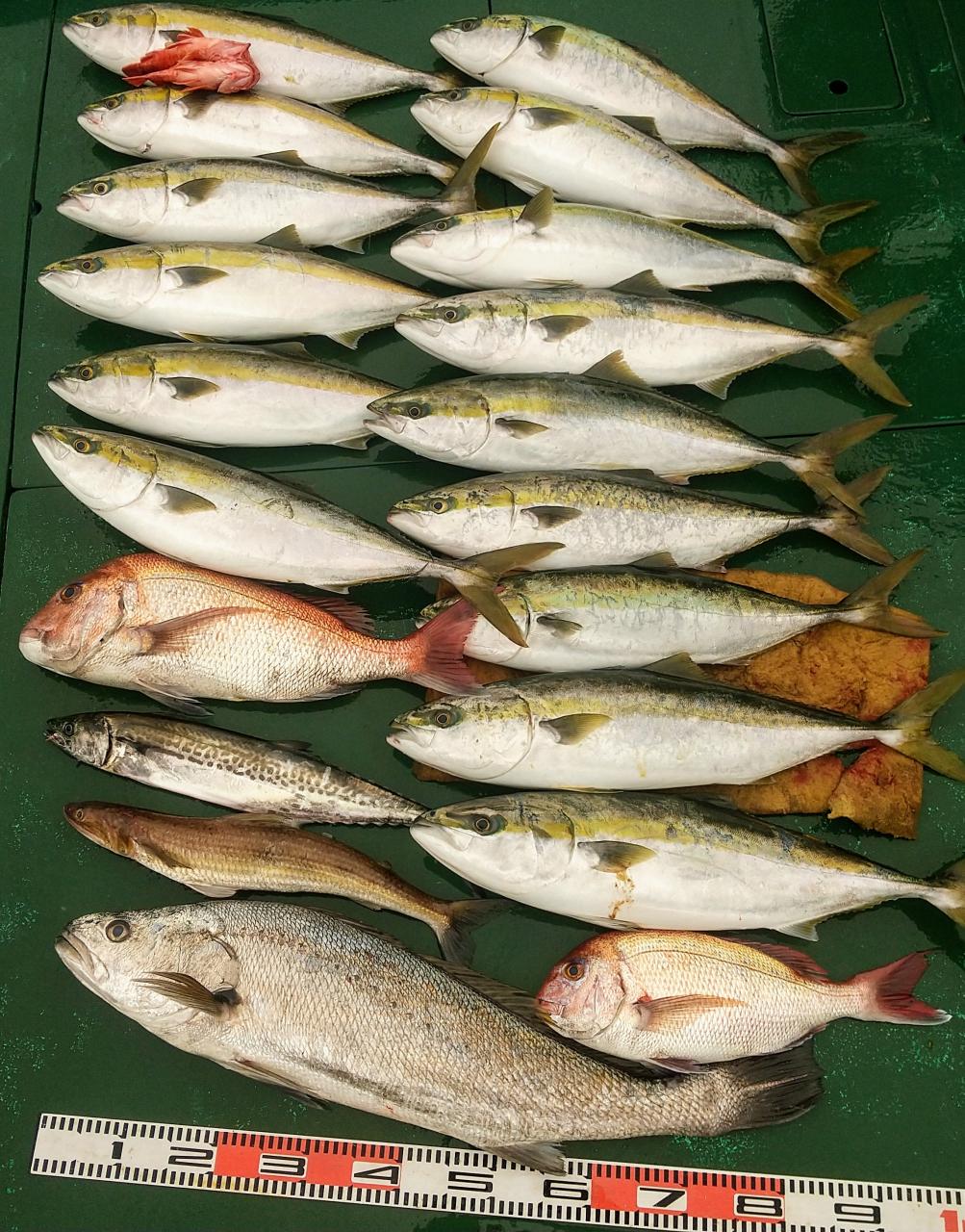 結果、マダイ、オオニベ、ハマチ、サゴシ、ホゴ、巨ESOでクーラー満杯に。