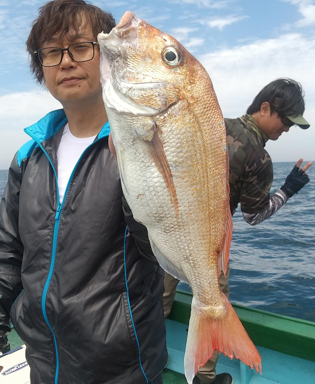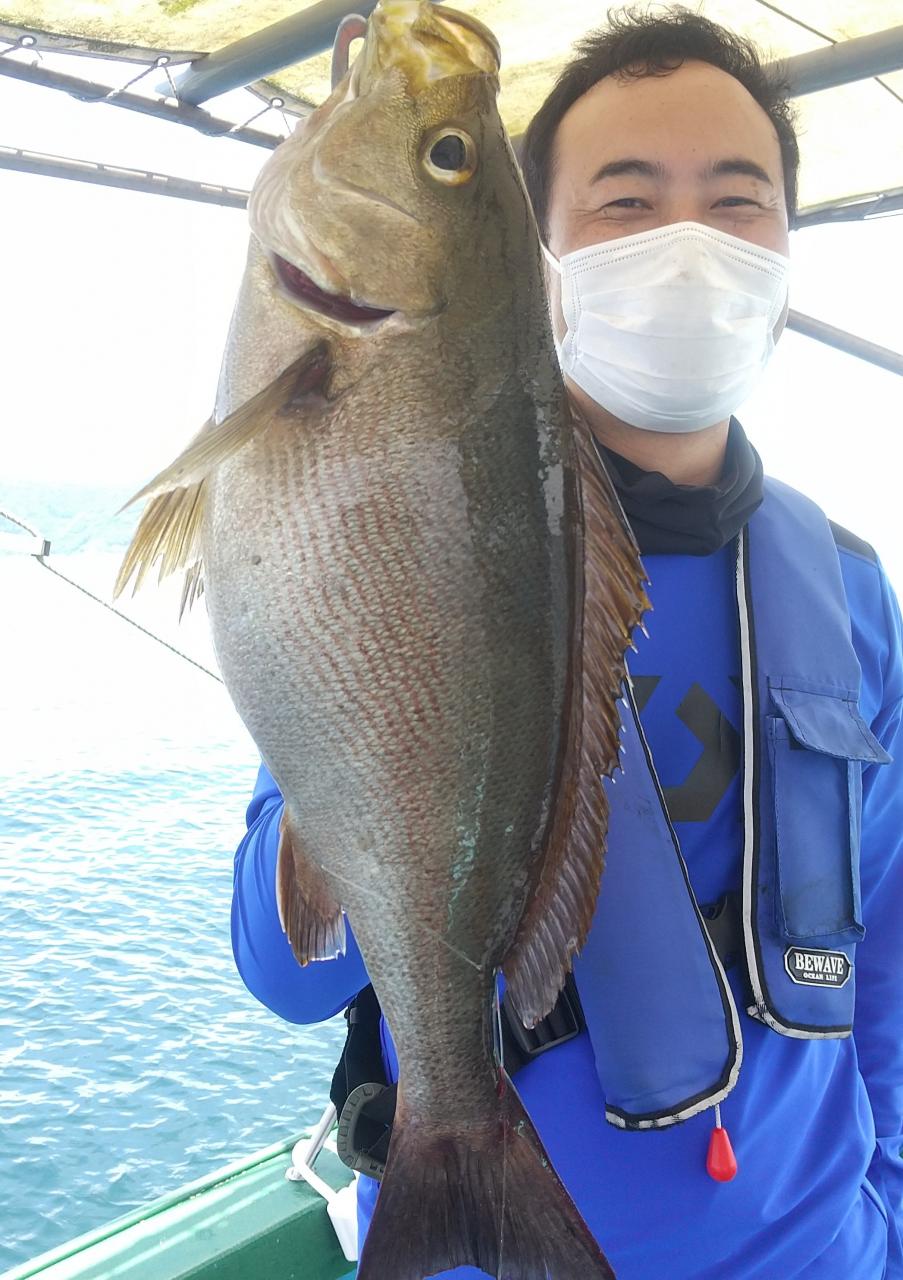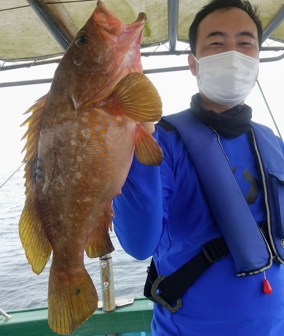 強烈な引きを楽しんで、潮が緩んでからはマダイ57センチ、大アコウ、イサキ、カンダイ、ヨカホゴと、全員ヒットしてヨカ釣果で有りました〜