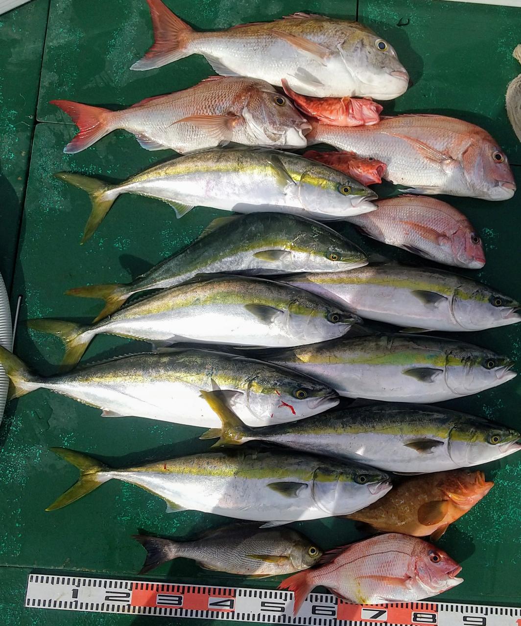 先日の地震の影響なのか台風接近による警戒心からなのかアオモノ君達はちょっと遠慮がち。数は伸びなかったけど、70センチ、62センチ、45センチのマダイ、イサキ、アコウ、ホゴ、ハマチでお土産はしっかりでした〜