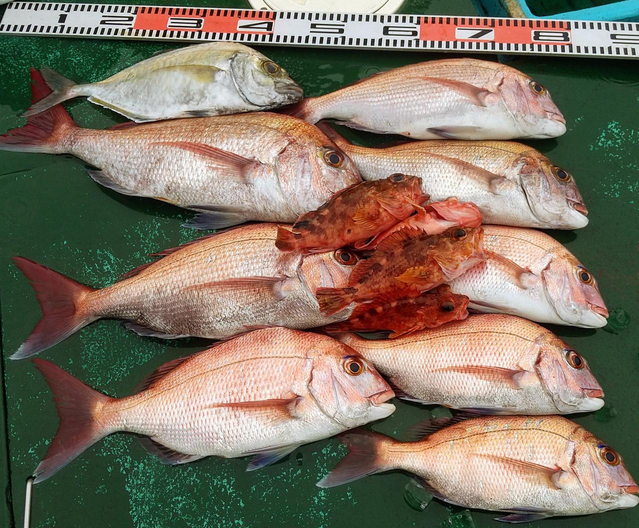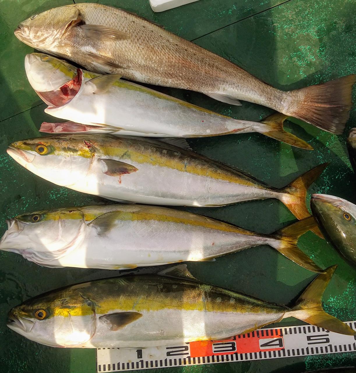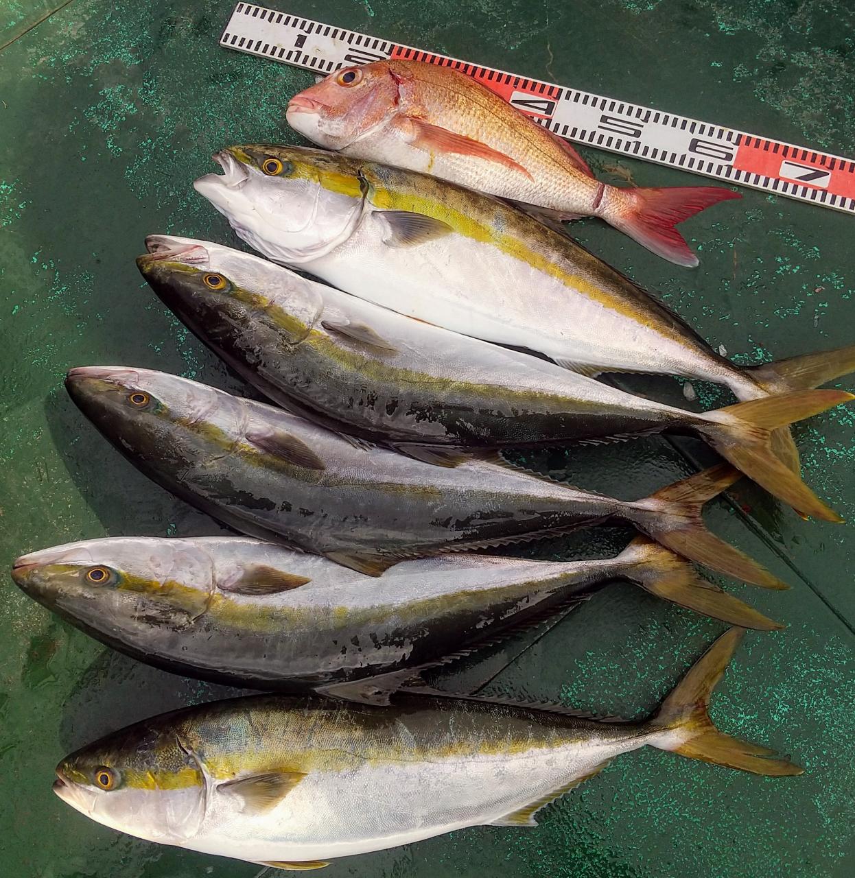 しかしそれでも短時間集中でマダイを釣って、マダイ、ヒラアジ、ホゴでクーラーは満タンに。
