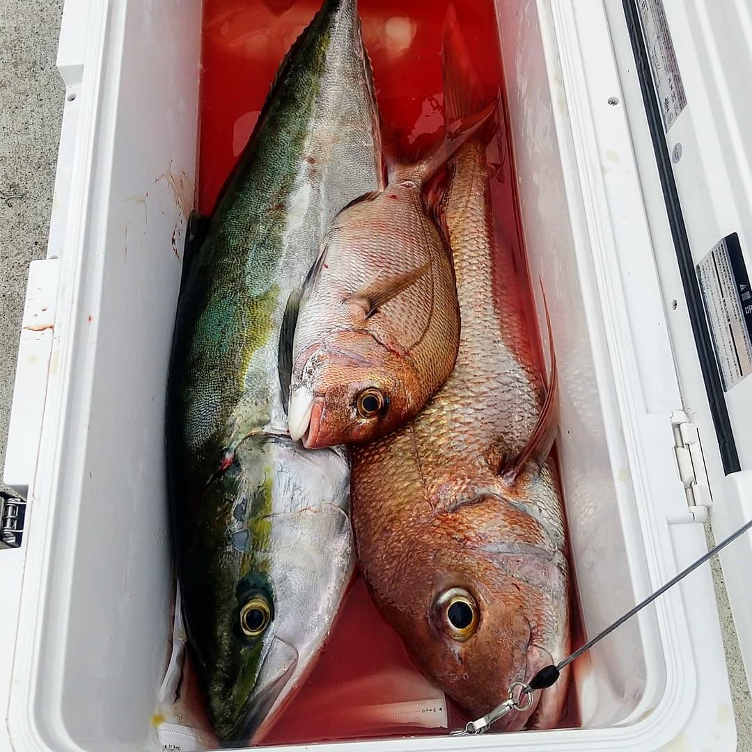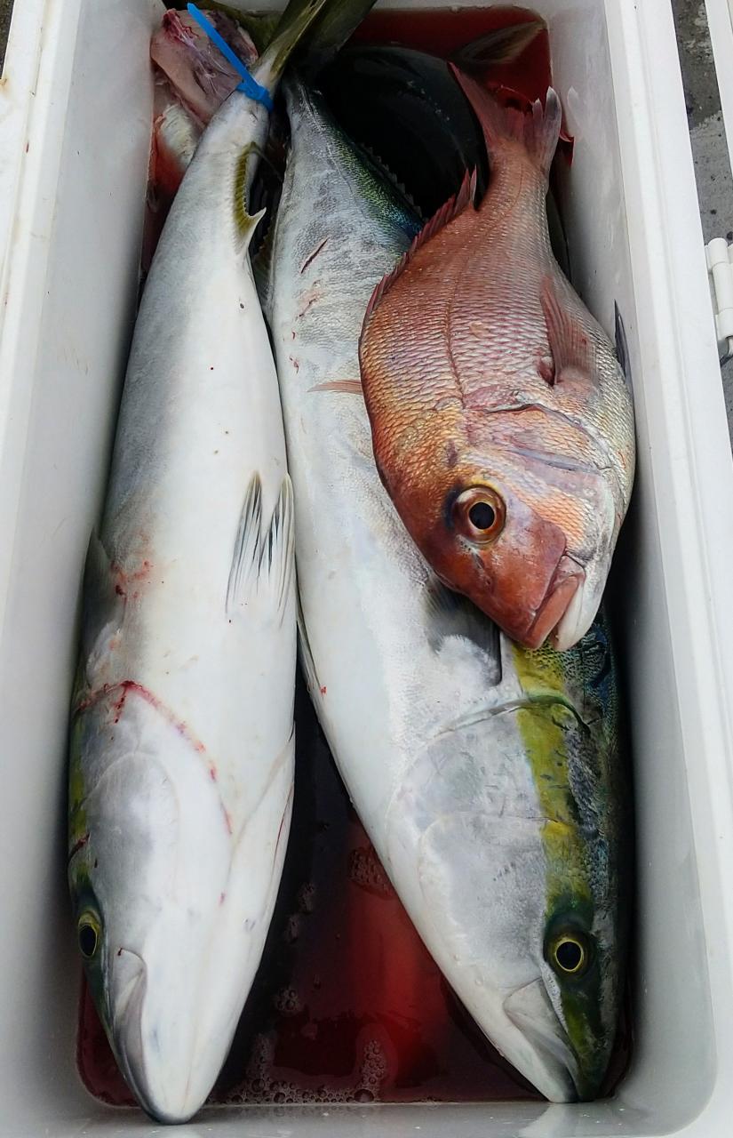 結果、今日は久々に雨が上り、風は強く釣り辛かったものの皆さんマダイ、ホトンドブリ、大アジ、大サバ、ホゴでクーラー満杯に。