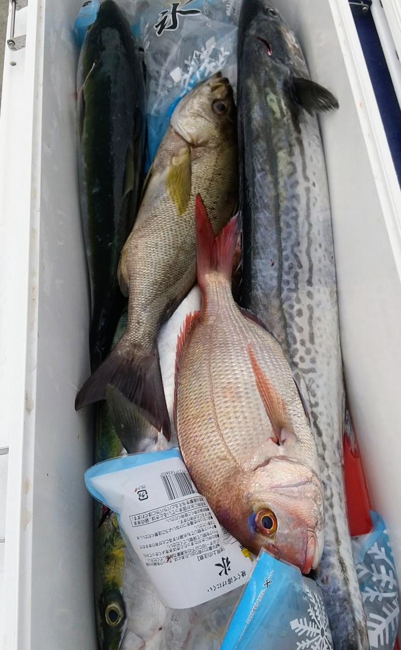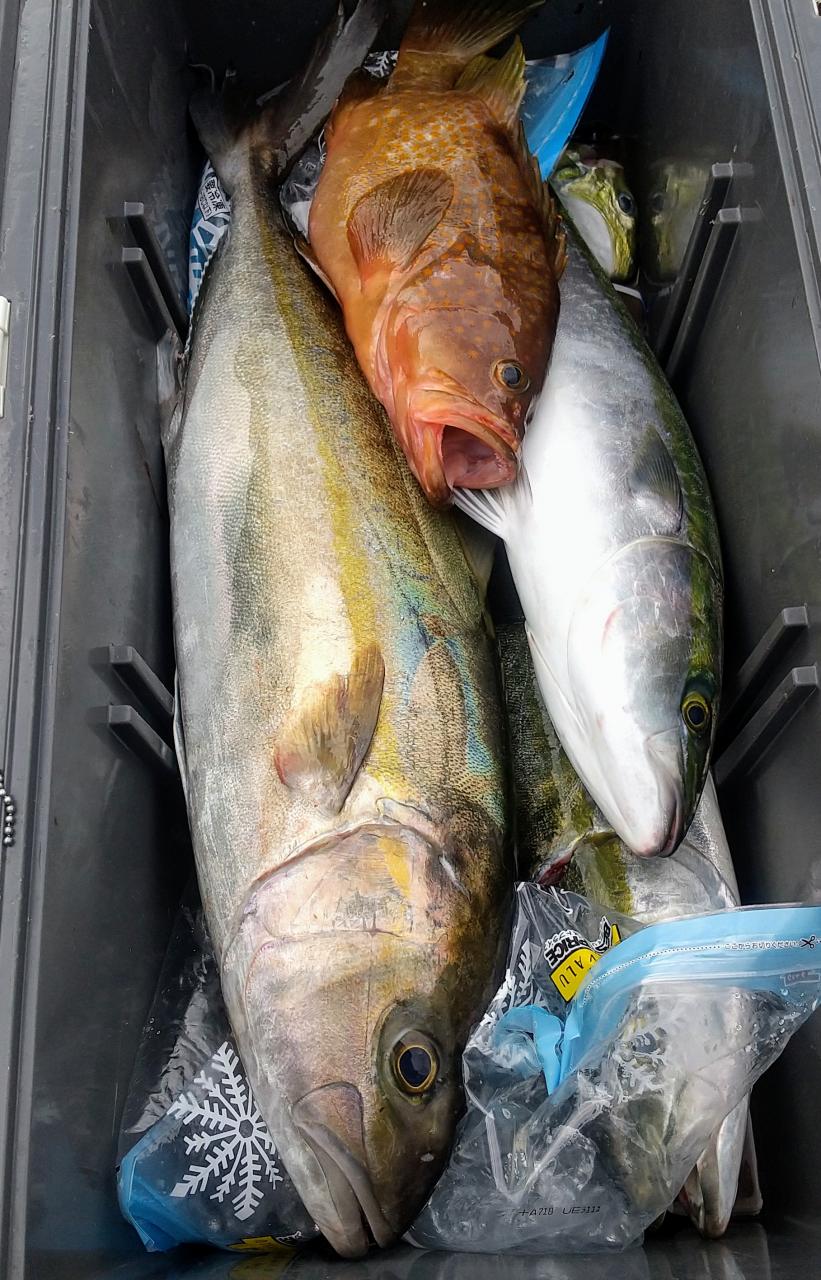 今日は午後から南東の爆風で風が出るまでの勝負でしたが、カンパチ73センチ、サワラ102センチ、イサキ50センチ、アコウ60センチ、大アジ50センチ、マダイ、モウチョットデブリ、ホゴで皆さんお腹いっぱいに。