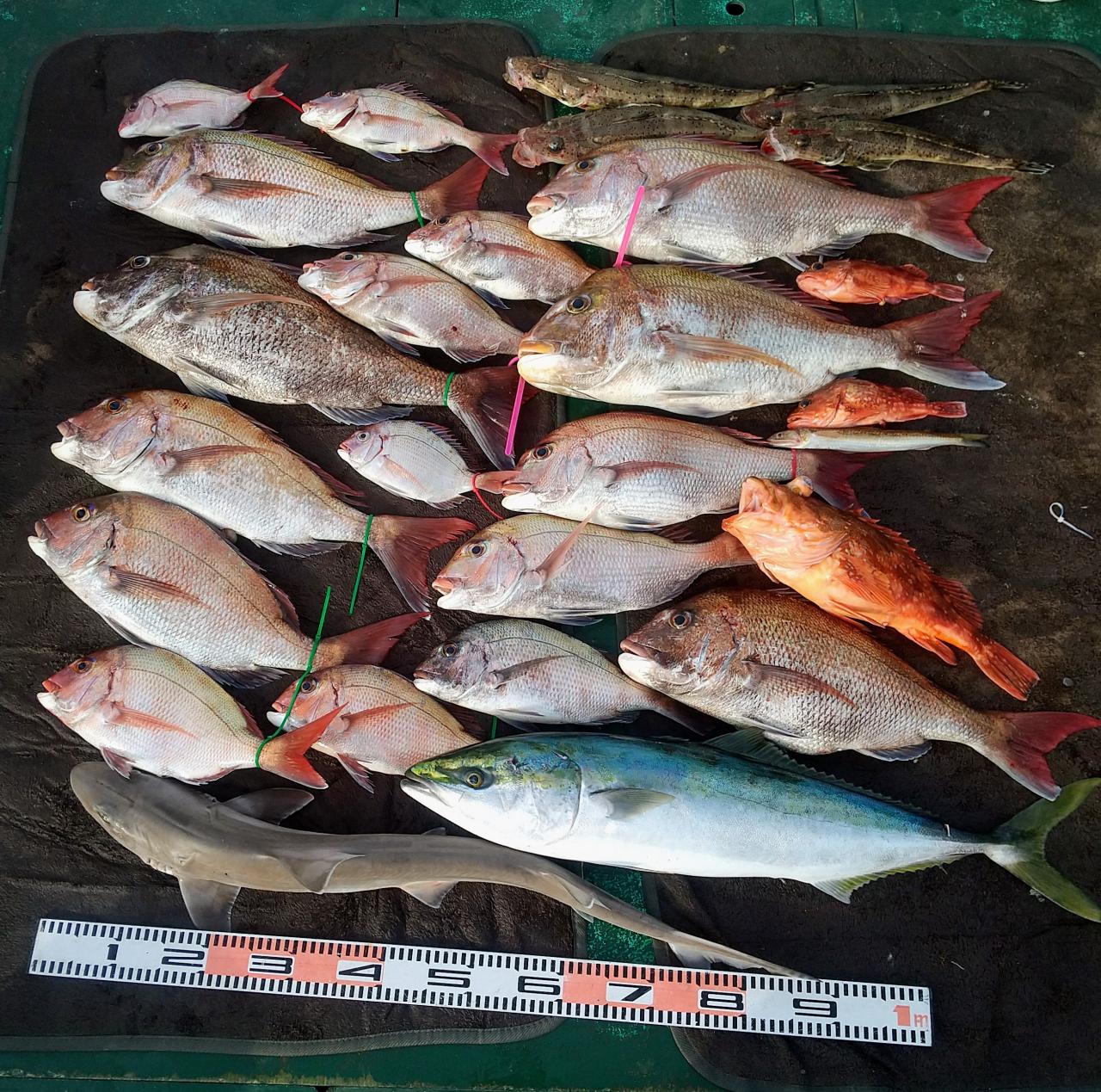 ブリ87センチ、大マダイ70センチ筆頭に〜、ダイゴロウ、イネゴチ、チダイ、ホゴ、そしてそして、今日もサメちゃん〜!