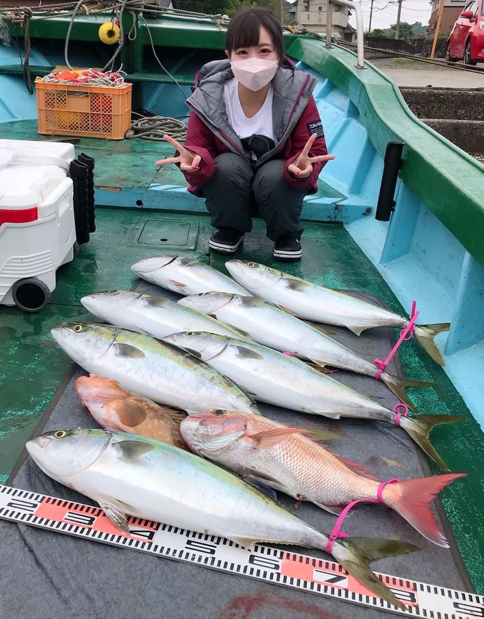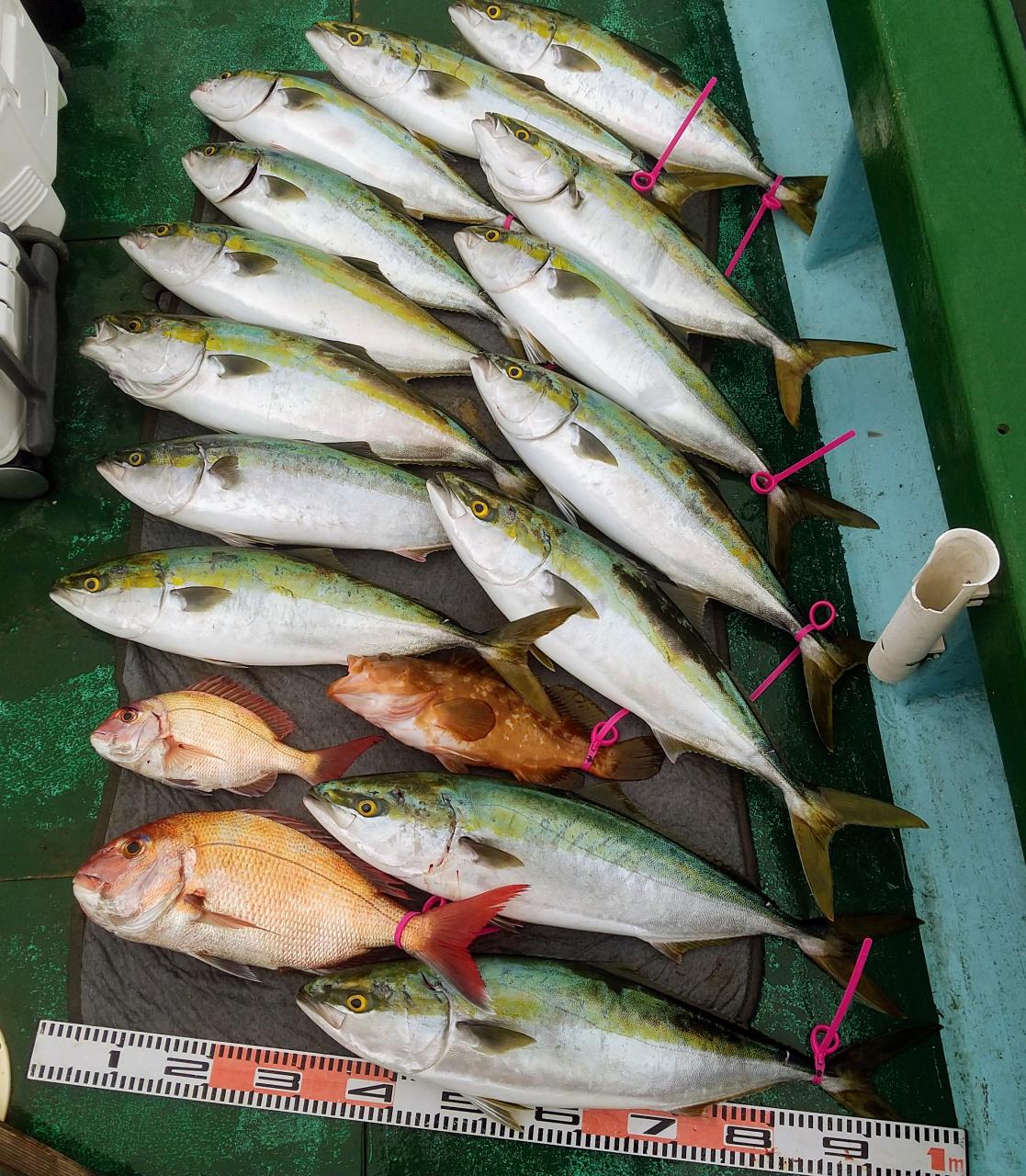 アオモノが丸々として美味しそう。凄い引きで次々とヒット!そして潮が緩んで来てからはマダイ、アコウもヒットしてくれて、イケスもクーラーも満杯でした〜