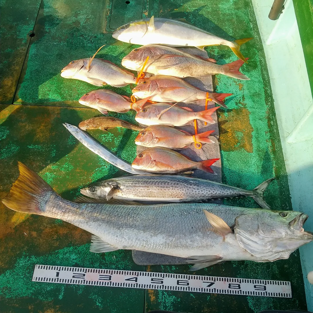それでも朝の潮の効き初めに90cmオーバーのサワラ!そして75cm5キロの大マダイ!その後良型マダイさんぽつぽつヒット〜!あとイネゴチとか。