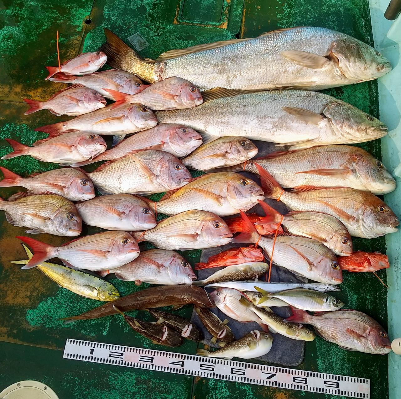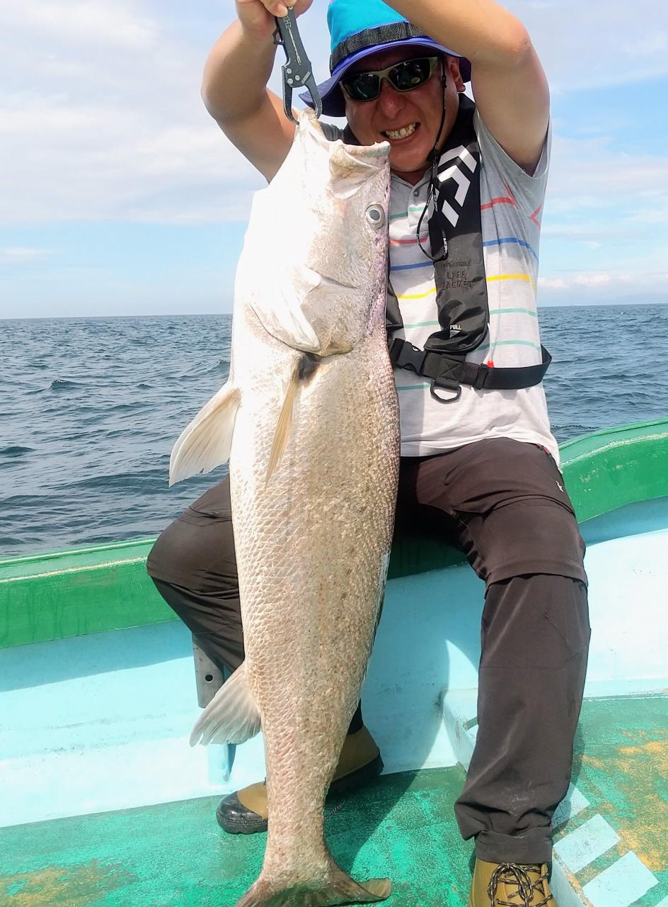 今日はオオニベ143cm(⁠(⁠(⁠;⁠ꏿ⁠_⁠ꏿ⁠;⁠)⁠)⁠)に始まり、マダイさんも82cmを筆頭に。