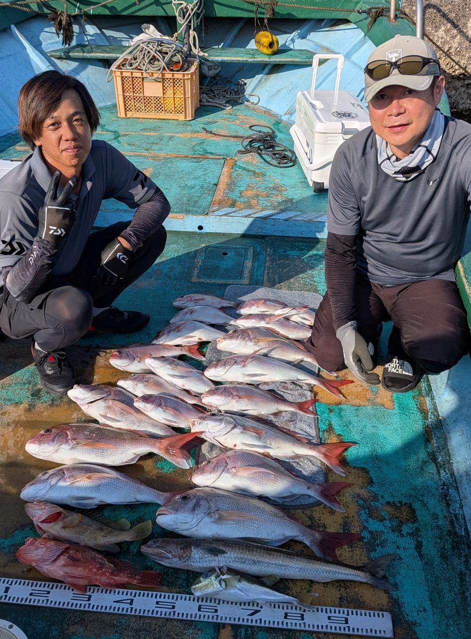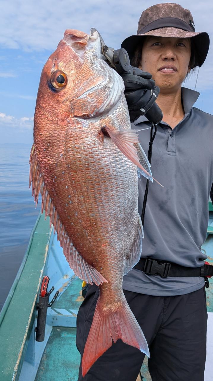 食いは浅いがアタリは頻発。元気にマダイさんイイ引きで上がってくれます。オーイーカンジー