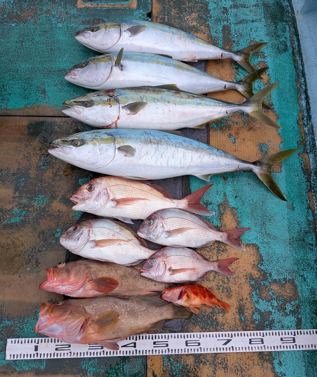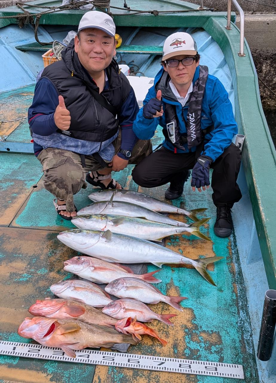 朝の内はなかなか食って来てくれないマダイさん達でありましたが、下げ潮流れ始めてからはマダイさんもぽちぽちヒット〜。元気なお子たちが強い引きで上がってくれます。そしてドデカアコウさんもヒット!