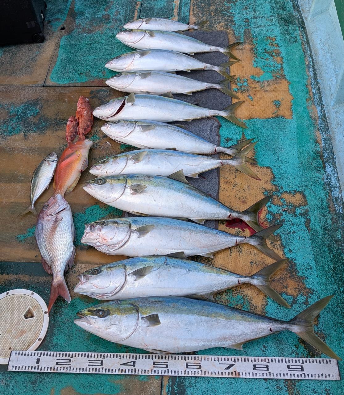 今日はお魚さんの食いが悪くしかも浅くて、なかなか食ってくれなかった上に食ってもスッポ抜け多発!て状況でしたが、最終的には皆さんブリハマチ、マダイ、ダイゴロウ、アオハタ、アジ、巨大ESOw、を見事キャッチ!!